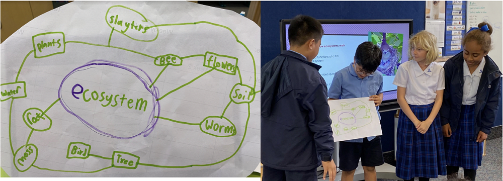 Ecosystems are made up of living and non-living things that interact with each other. One of the activities we did was walk around our school and look for ecosystems and we observed how the soil supports flowering plants, that provide food for the bees. Also, worms and millipedes hide under rocks while moss need rocks to grow on. When we got back to the classroom, we made a diagram of our school's ecosystem.