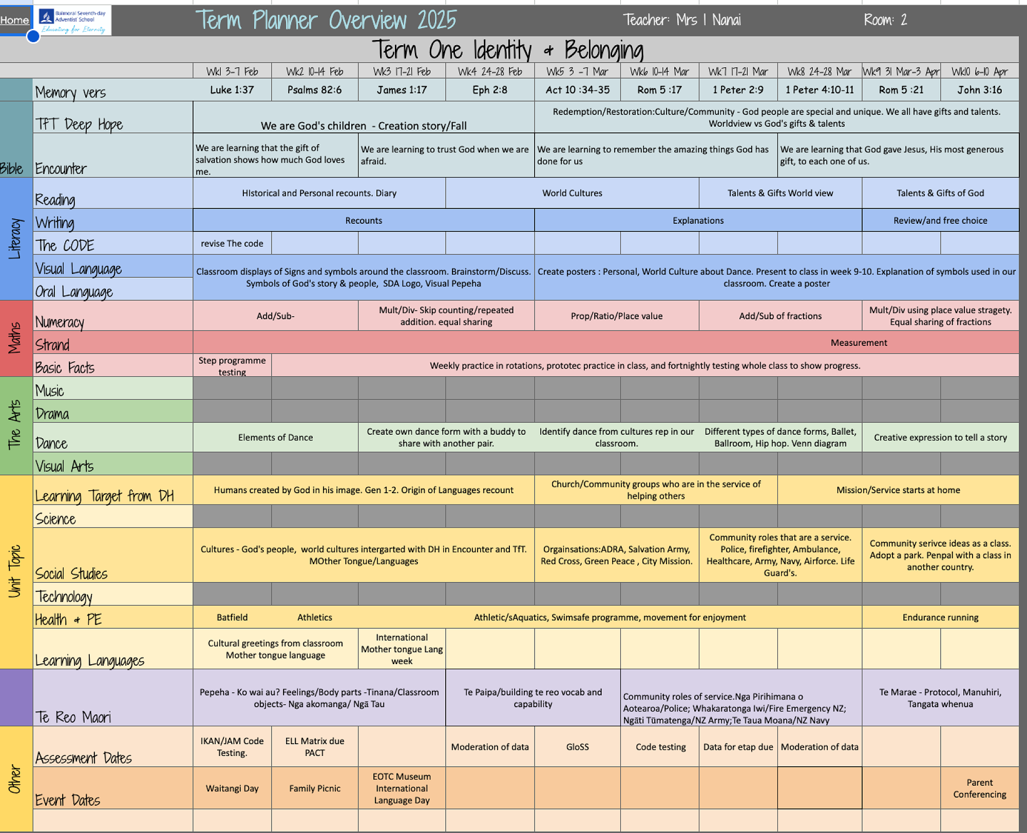 We have daily fitness, and Friday JUMP JAM along with P.E on Friday's and we will be looking at Athletics and Aquatics -Swimming starting in Week 3. Our Annual Athletics day with Waitakere SDA School is this term and details about that will be coming out soon. Please ensure your child is wearing their Sports Uniform each Friday or on days of swimming.