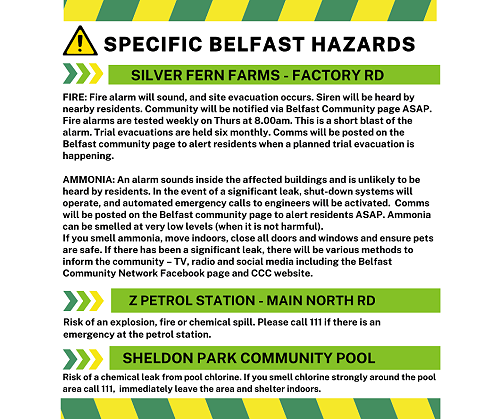 Belfast industrial area, with multiple hazards, the Z Petrol station on Main North Rd and the Sheldon Community Pool (chlorine leak). Please be aware, and make a household emergency plan for evacuation or surviving without essential services. Remember Civil Defense can take up to 3 days to arrive in a disaster. Check on your neighbours and vulnerable community members.