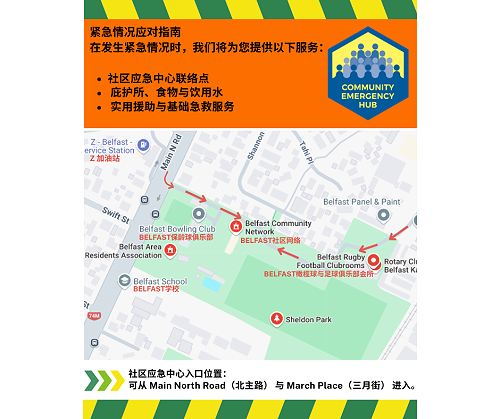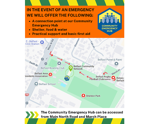 If there is an emergency, the BERP will be enacted and if safe to do so 1 or more of the following facilities in Sheldon Park will be available: the BCN, the Rugby Club, and the Bowling Club. If you need to leave your dwelling, make your way to Belfast Community Network facility, (710 Main North Rd), or one of the other facilities if BCN is unable to open. Look out for the blue Community Emergency Hub Signs. See pictures below for a map of the park area.