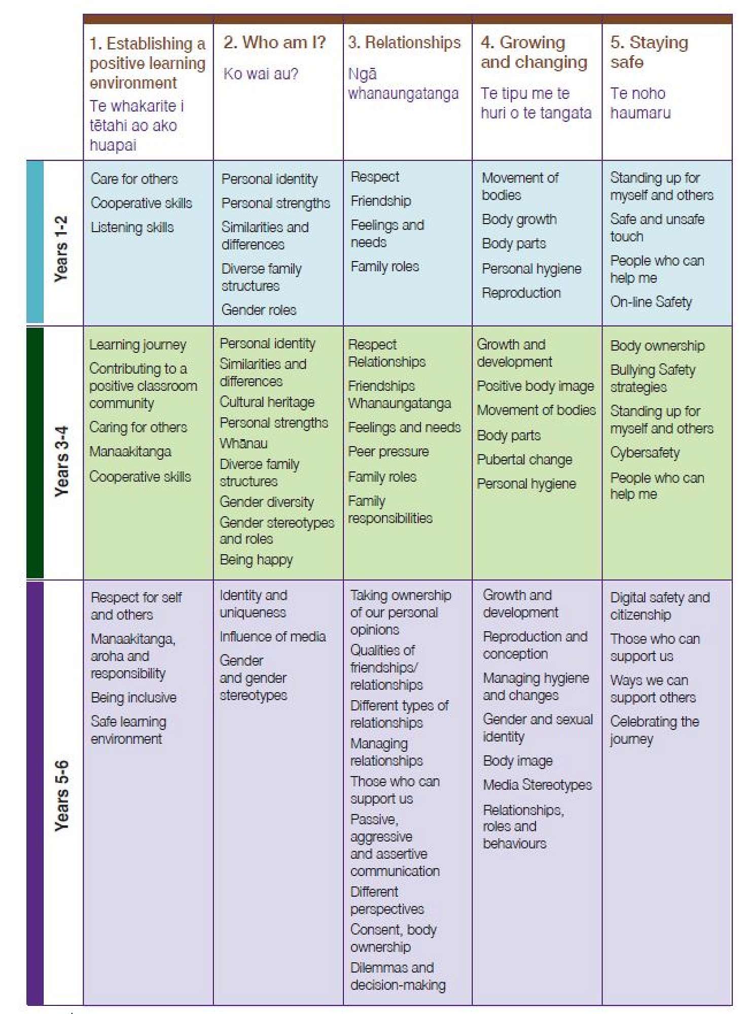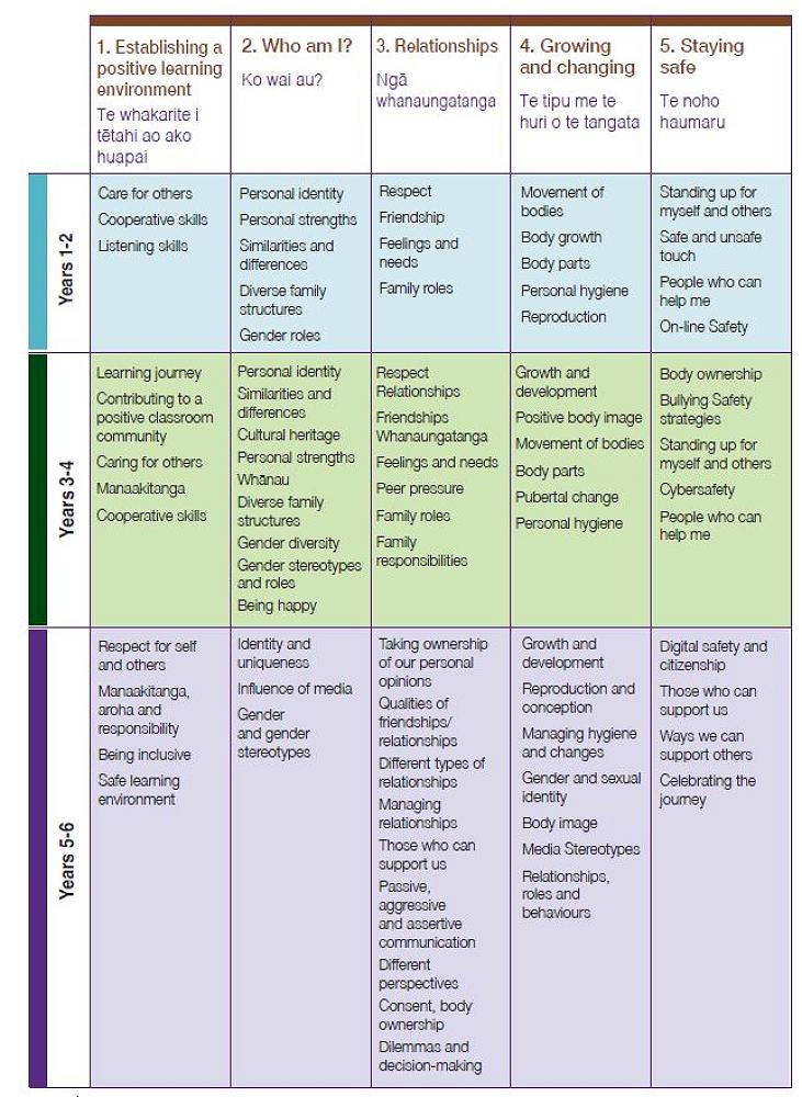 During the latter part of this term Bishopdale School will be teaching RSE. This is an important component of the health and physical education learning area of the curriculum. While some may see the word sexuality and think that this part of the curriculum is only relevant to older students, RSE is actually a comprehensive and holistic programme that covers many topics. For younger learners, these topics include life skills, identity, respect, friendships and feelings, as well as the biological topic such as body parts and how reproduction works. For older students, topics such as puberty, intimate relationships, contraceptives and sexually transmissible infections feature. In the following charts, you can see what topics will be covered in each year with the Navigating the Journey resource.