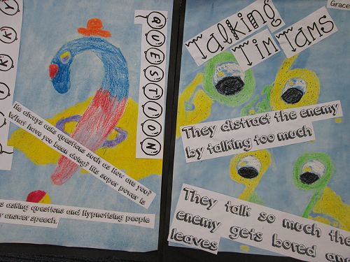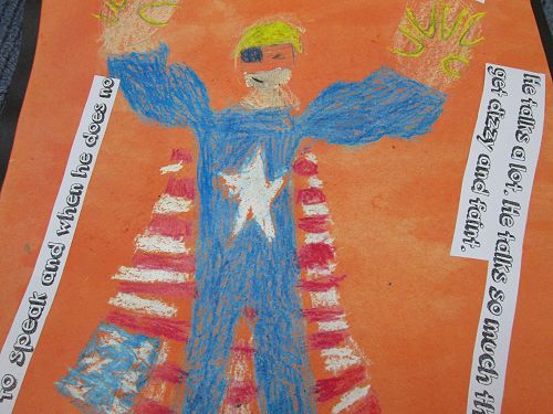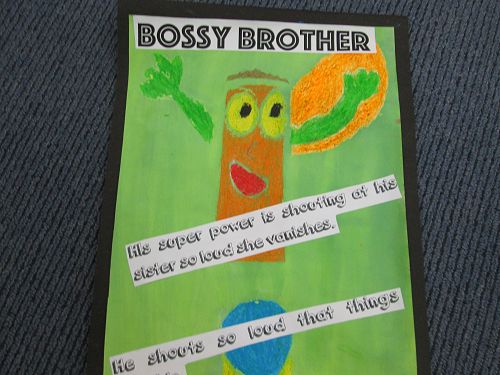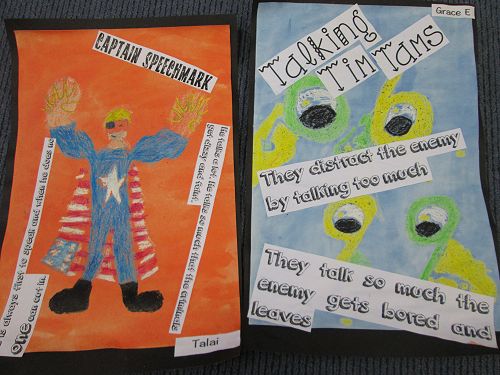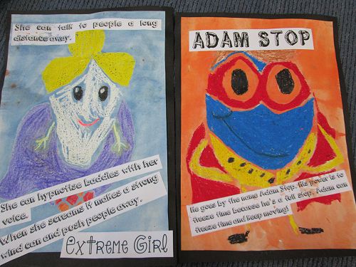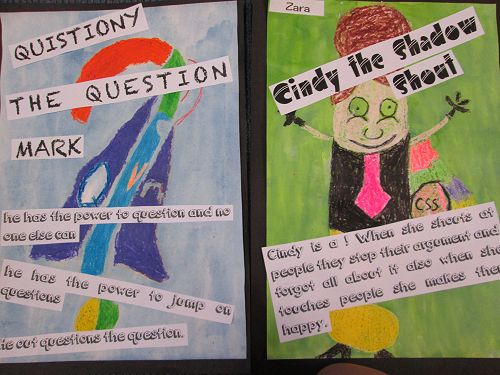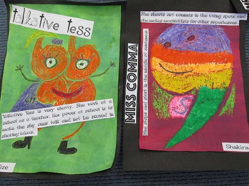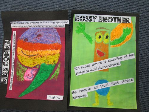 In Room 14 we have been busy creating our own super hero comic book. The characters are actually various forms of punctuation which have been personified into Super Heroes. The students have chosen one of their four designed characters to publish for our class comic book. Have a look at our book in the attached photographs.
