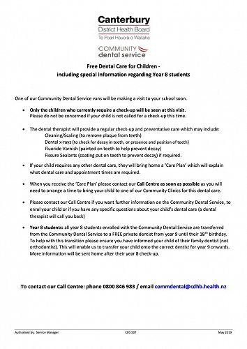 Year 8 students: all year 8 students enrolled with the Community Dental Service are transferred from the Community Dental Service to a FREE private dentist from year 9 until their 18th birthday. To help with this transition please ensure you have informed your child of their family dentist (not orthodontist). This will enable us to transfer your child onto the correct dentist for year 9 onwards. More information will be sent home after their year 8 check-up.