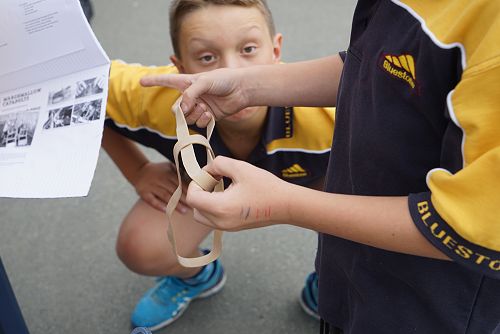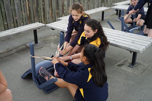 The transformation of energy happens when you pull the rubber band on your catapult back, your muscles do the work. This is stored as elastic energy in the rubber band. When you release the band, it does the work on the marshmallow and the elastic energy is transferred in the flying marshmallow. When the marshmallow hits something (the target) it stops and the energy is transferred into heat.