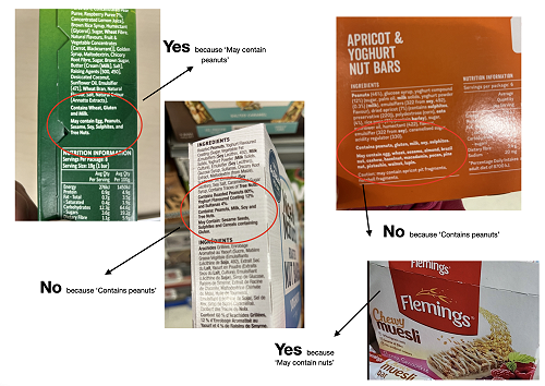 Muesli bars are an option so long as the label does not say 'contains peanuts'. Many options are available that say 'may contain traces' and these are acceptable.