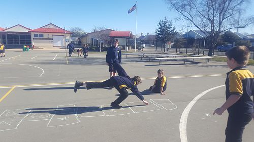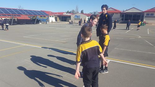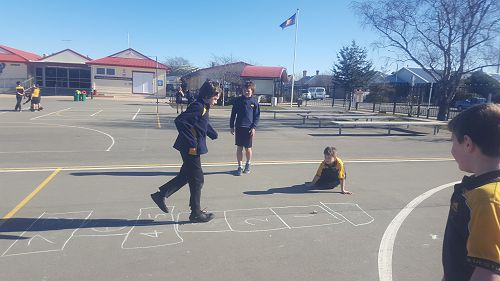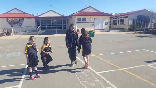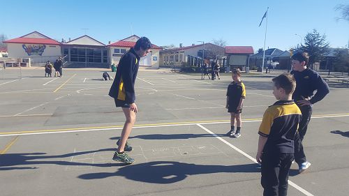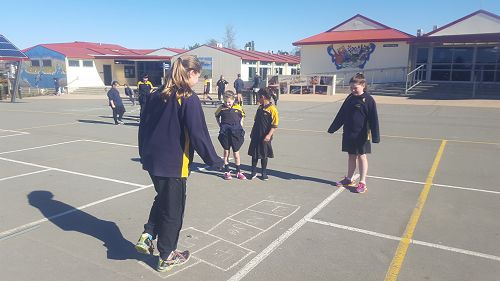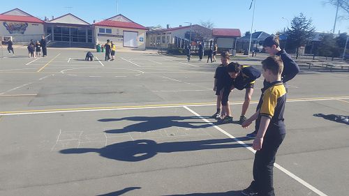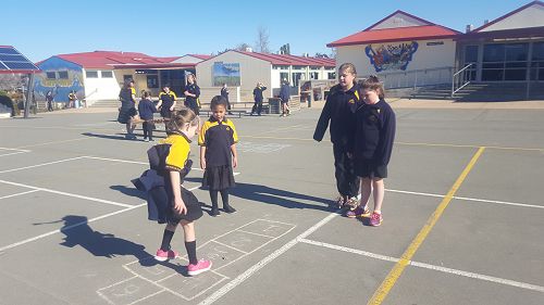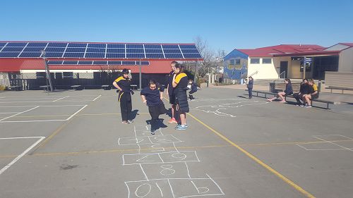 For the treasure hunt, we hid crayon boxes around the school, and we had to instruct our little buddies how to find them by only using half and quarter turns; then we swapped over. After that we played hopscotch, we drew our own designs on the courts with chalk.