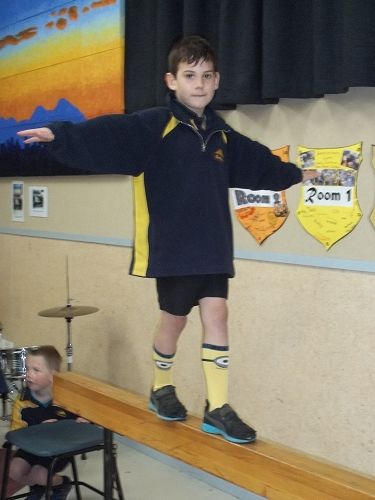 During Term 3 our Game Sense focus is gymnastics. The children warm-up at the beginning of our sessions with some Jump Jam (movement to music). We began gymnastics with pencil rolls, trying hard to keep our legs and arms straight and then moved onto forward rolls. We have used the beat board to jump onto the box horse, and then jump and land on a mat. The beam is a favourite and even though some children were a little apprehensive to begin with, they all managed to balance and walk along it. The children really look forward to Game Sense and they would like to thank Julie for organising the equipment and teaching them new skills.