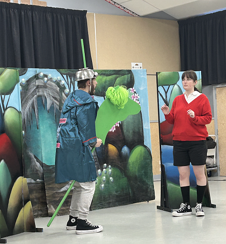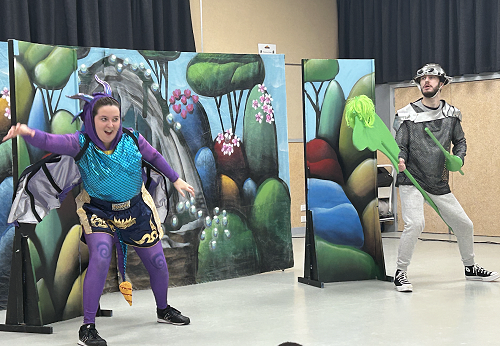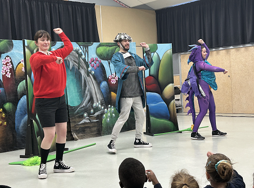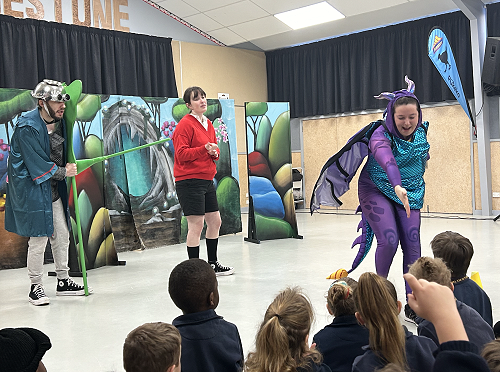 On Friday 7th June we had a visit from the NZ Playhouse who performed a funny, educational and inspiring show for the Year 1-4 students about the reluctant dragon. It was about a Southern Shiny Blue Scuttleclaw Dragon known for being friendly, sophisticated and highly sociable. This dragon likes to sing and write poetry. When he arrives in a town there is chaos when the townsfolk hear about the dragon. Sir Mr Beast-Slayer is sent to fight the dragon. The Dragon and Sir Mr Beast-Slayer both realise they don’t really know how or want to fight. Sir Mr Beast-Slayer explains how all the fights on his Youtube channel are made up and use CGI. The Dragon suggests they make a pretend video where it looks like Sir Mr Beast-Slayer wins and the Dragon will then promise to be good and everyone will be happy. This happens and all is well in the town, with the dragon helping out the community by whenever there is no wind to blow their wind turbines the dragon will puff and blow them himself.
