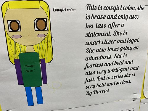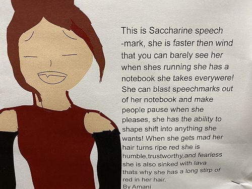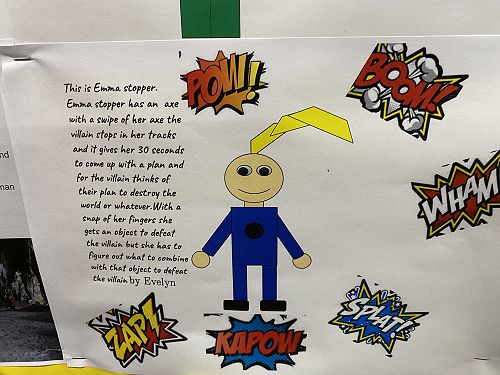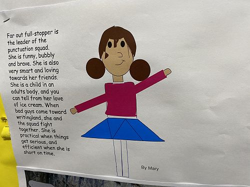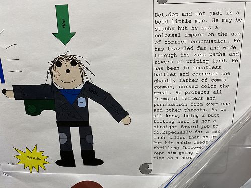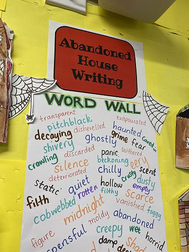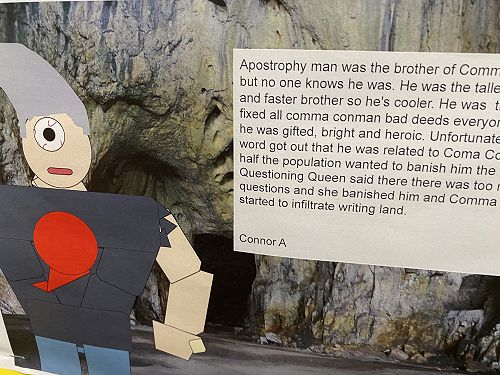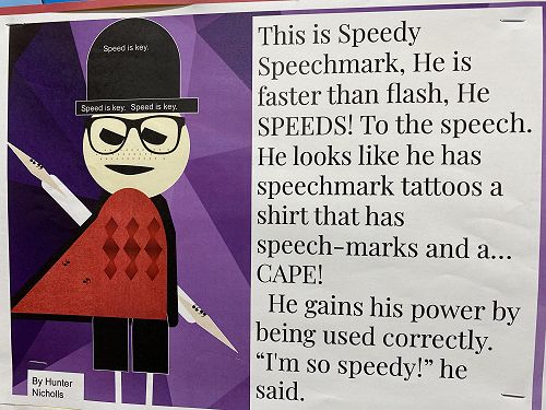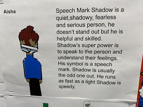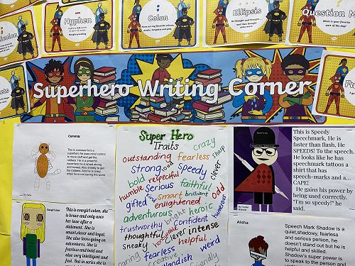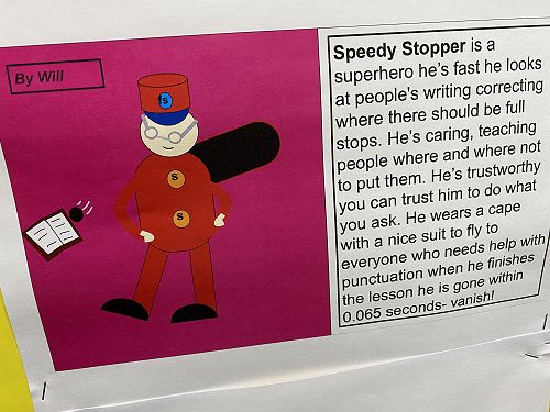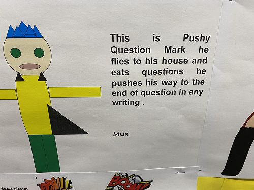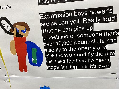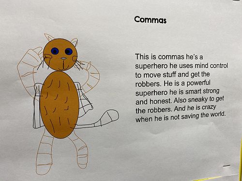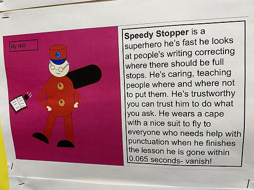 The students have been working on using word walls to increase their vocaubulary complexity when they write. Two stand out pieces of writing for ths class this term would have to be their Abandoned House writing and their Punctuation Super Heroes.
