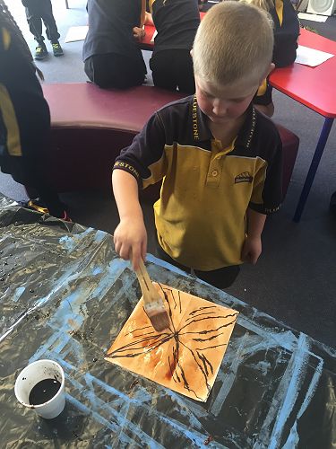During Tongan Language Week, Room 3 worked on creating a tapa cloth. We had a go at drawing symmetrical patterns with pencil first and then tracing over it with vivid. We then used brown dye to make it look old. Then we screwed up the paper to make it look older and more like material. To finish it off, we glued all of our creations together to make one big tapa cloth. We think it looks 'really cool'.