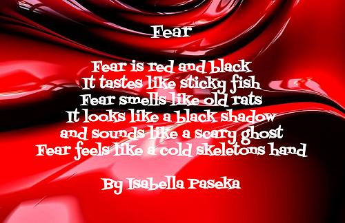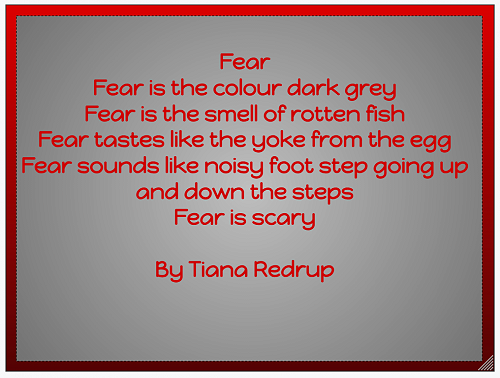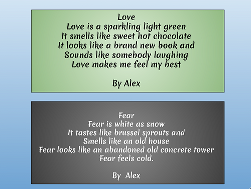 We chose a human emotion then wrote our ideas using colour, taste, smell, look, sound and feel to describe the feeling we chose.