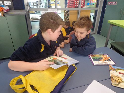 The first role of the senior buddies is to test the spelling words and the basic facts the little buddies have been learning for the week. After that, the little buddies read their books to the senior buddies and often the seniors read to them. It is a wonderful opportunity for the students to get to know each other very well throughout the year.