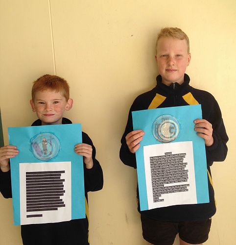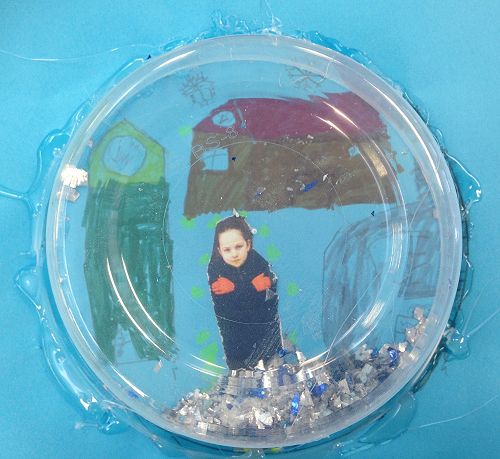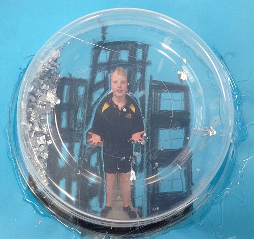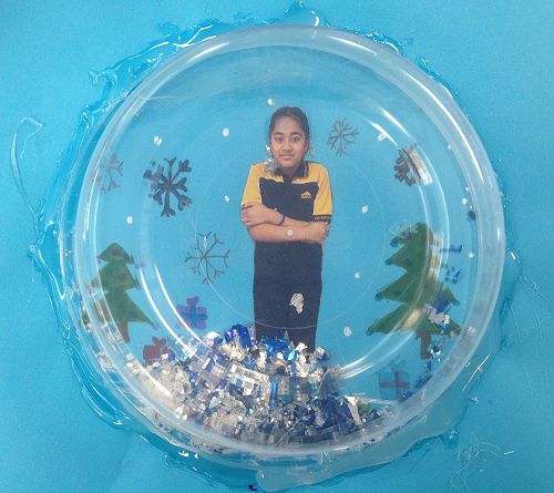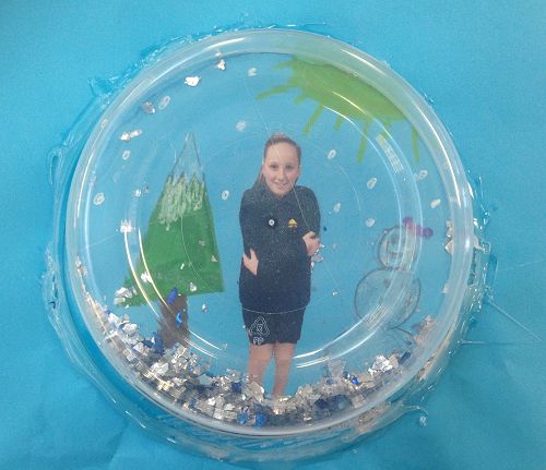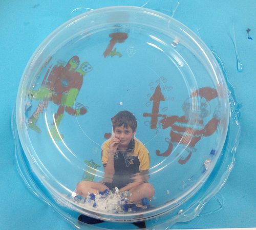 Once the story was written and published we then worked on the art work. Each student had their photo taken. This was cut out and stuck on. A background was drawn before the glitter and salt were added. Lastly a plastic bowl was hot glued on.