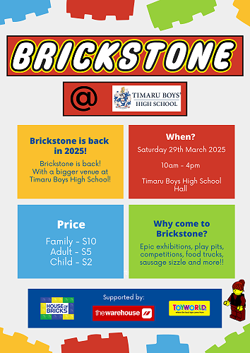 Brickstone is happening again. It was so successful last time that we are going bigger and better for our 2025 show. Brickstone 2025 will be held at Timaru Boys High School in their hall. This will allow us to have more exhibitors and more room to move around to see all the exhibits.