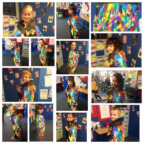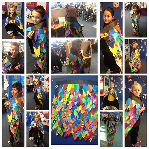 Room 10 made feathers from paper and designed them in the style of Ruben Patterson an Artist who they have been studying this term. This cloak represented them as individuals and as a class.