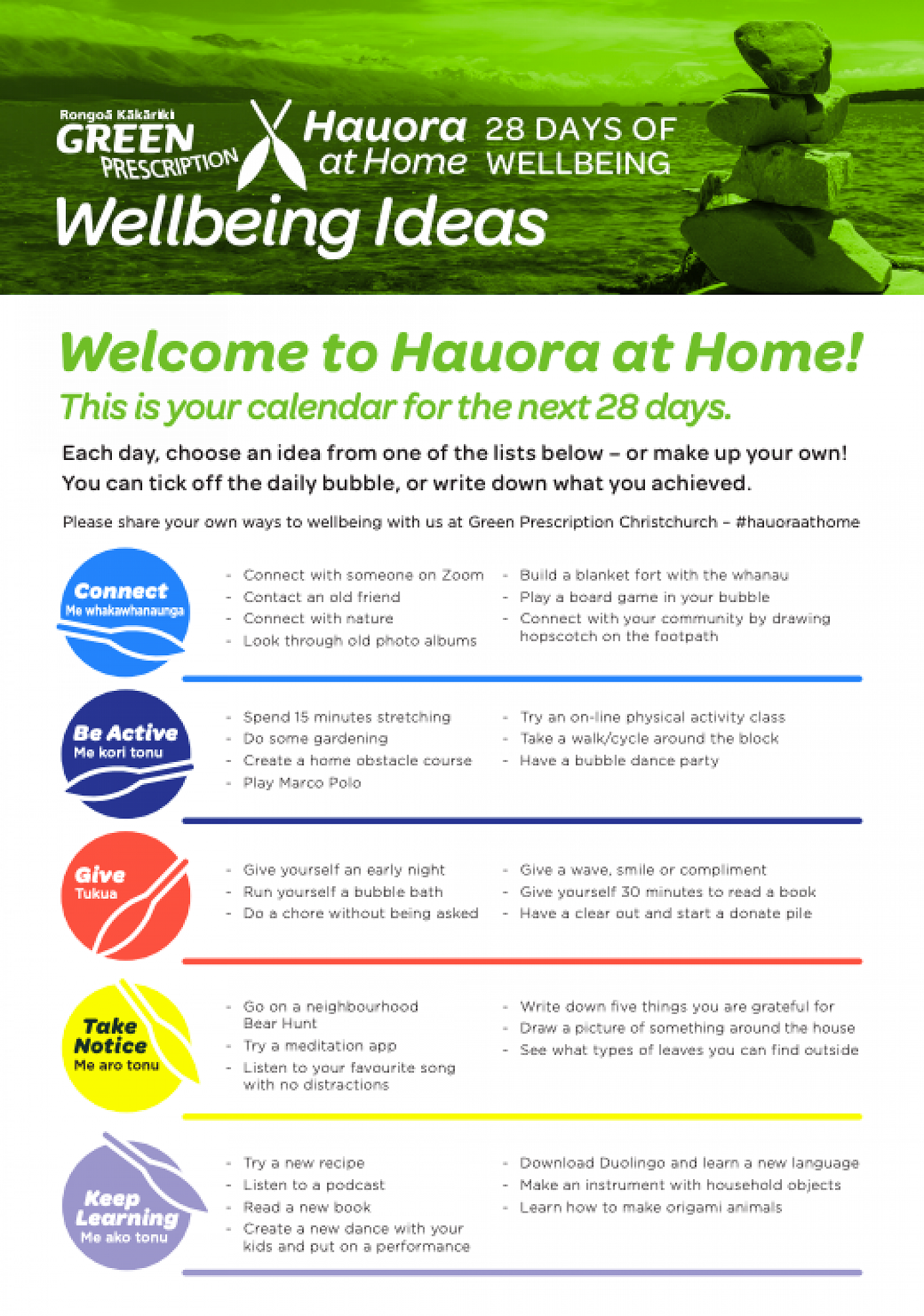 Check out this hauora calendar of ideas from the Sport Canterbury Team. This would be a great licence task!