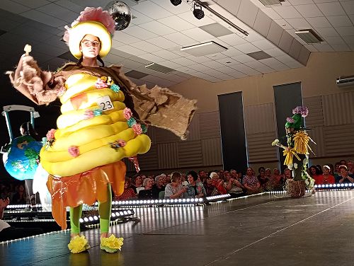 Our NZ Legend Hilary, There is no Planet B, Antarctic Tragedy, Let it Bee, Bedlam Beast, Disaster at Oz, Dreaming your Couture, and Anyone Can Bloom represented Breens and themselves admirably in the Open Section. All the garments looked stunning on stage. Hilary was elegant both in its design and in the modelling, Planet B had great impact from a distance and up close. Antarctic Tragedy’s whale was skillfully manoeuvred for maximum impact and our duo in Disaster at Oz worked beautifully together, the tornado giving the garment extra movement and depth of design. Our heart in dreaming your Couture was dazzling in both its clever design, careful execution and bold explosion of colour.
