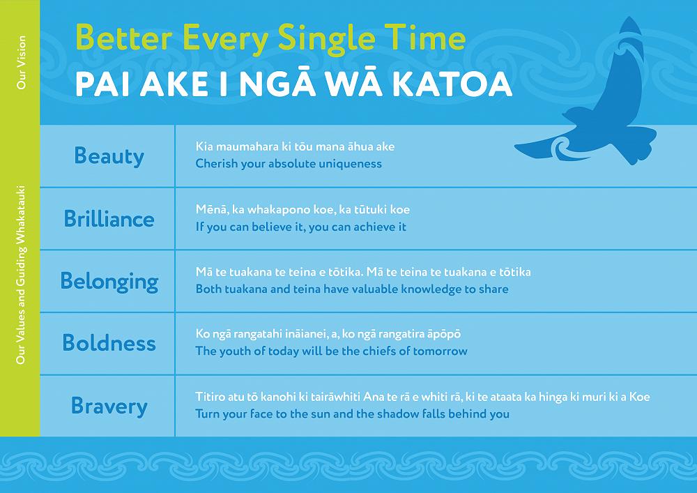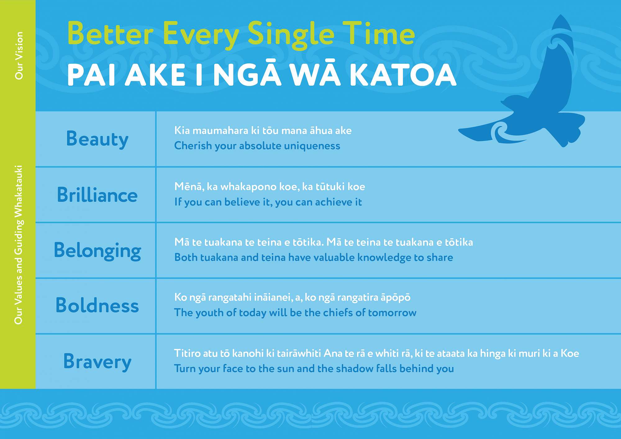 The five whakatauki give us direction and guidance in our understanding of the five school values.