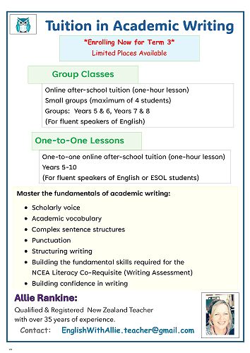 Tuition in Academic Writing - Enrolling now for Term 3. On-line after school tuition in groups or one on one. Qualified and registered NZ teacher with 35 years experience. Contact EnglishWithAllie.teacher@gmail.com See info attached.