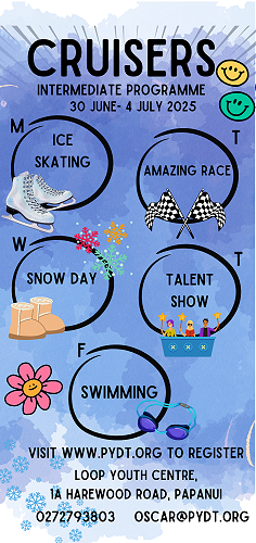 PYDT Cruisers Intermediate Holiday Programme - 30th June - 4th July at the Loop Youth Centre, 1A Harewood Road, Papanui.