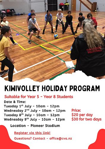 KiwiVolley Holiday Programme - Canterbury Volleyball is excited to be running our holiday skills session for Primary aged children through the 2025 School Holidays. It will be a fun, action packed morning where we will cover all the basic skills of serving, passing, setting and spiking with lots of fun games and drills.