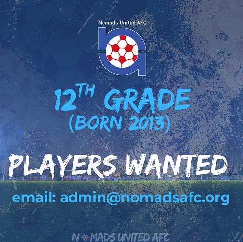 Nomads United Junior Football - We are still looking for a few players for our 12th grade football teams, this means players born in 2013. If you would like to play please contact P: 027 359 5791 W: www.nomadsafc.org