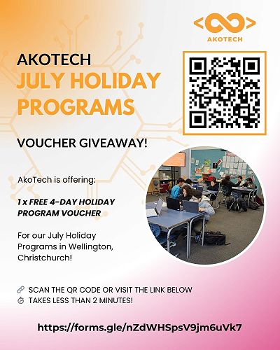 Ako Tech Holiday Programme - Looking for an engaging and educational holiday activity? AkoTech's Holiday Programs at University of Canterbury, Christchurch, offer hands-on experiences in coding, logical problem solving, and AI entrepreneurship. Students can explore their interests in project-based learning with technology. Programs run throughout July from 9 AM - 4 PM. Learn more and register at www.akotech.nz.