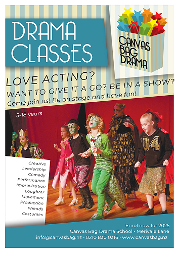 Canvas Bag Drama Classes - After school drama classes for ages 5-18 are back for 2025. We have spaces available across all campuses. This year we continue with our strong support in Merivale (Rangi Ruru Girls School), Halswell (Halswell Community Centre) but also are now proud to offer classes in Bromley Reserve (Bromley Reserve Community Centre). See info attached.