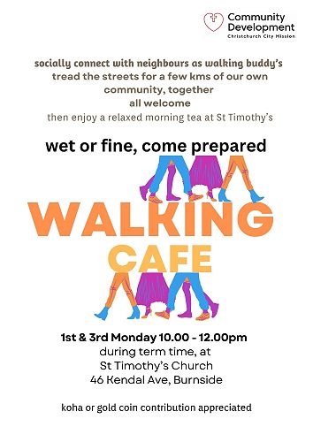 Walking cafe - 1st & 3rd Monday, 10.00am - 12.00noon, St Timothy's Church, 46 Kendall Ave. Socially connect with neighbours as walking buddies, then enjoy a relaxed morning tea. See info attached.