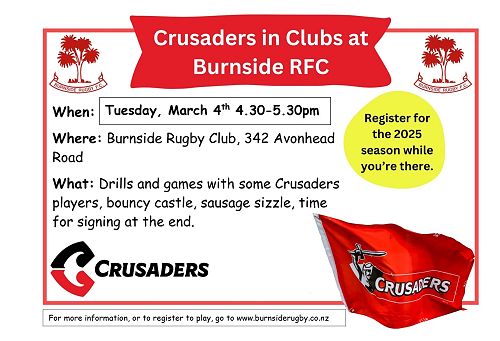 Burnside RFC Junior Rugby - Drills and games with some Crusader players, bouncy castle, sausage sizzle. Tuesday 4th March, 4.30pm - 5.30pm at Burnside Rugby Club, 342 Avonhead Road. Register while you're here. See info attached.