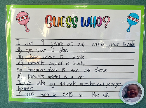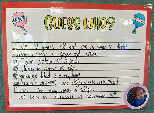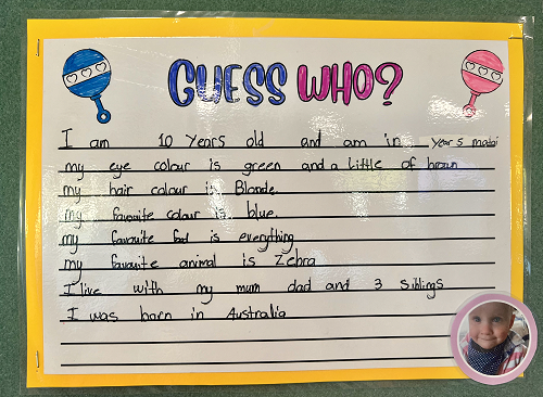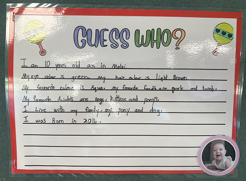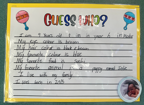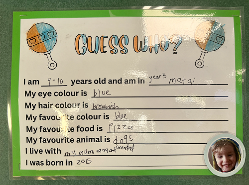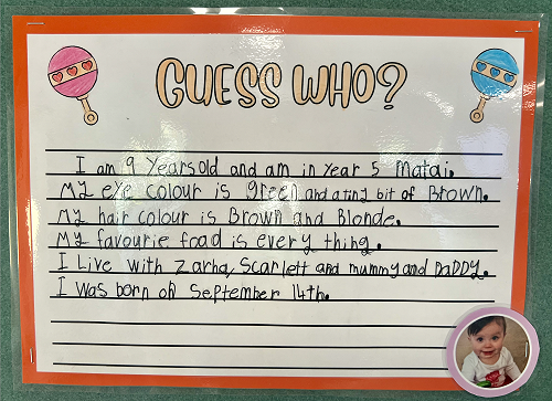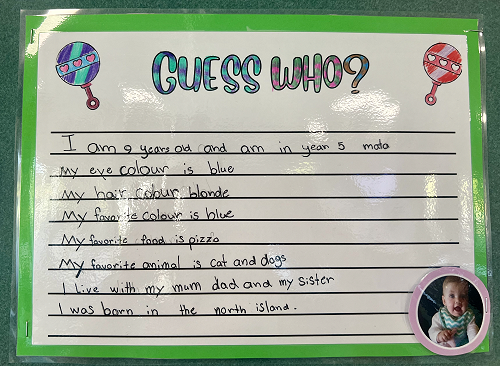 In Mataī during the first couple of weeks, we wrote a piece of 'Guess Who?' writing about ourselves. We included things like hair colour, favourite food, eye colour, age, whānau and then paired our writing with a baby photo.
