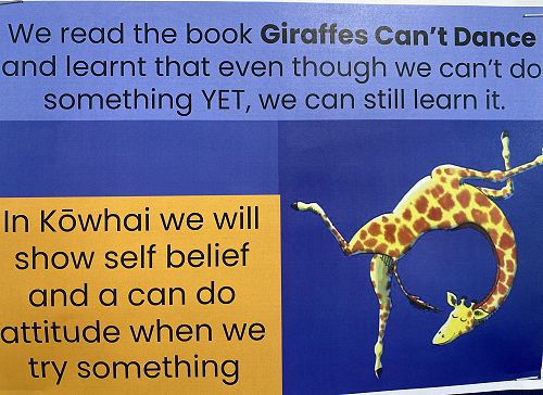 Kōwhai akonga read the book Giraffe's can't Dance by Giles Andreae, where Gerald the giraffe loves to dance but the jungle animals make fun of him and make him feel useless. A friend encourages Gerald to try to dance by listening to a different song. Skeptical at first, Gerald finds his song and finds he can dance rather well.