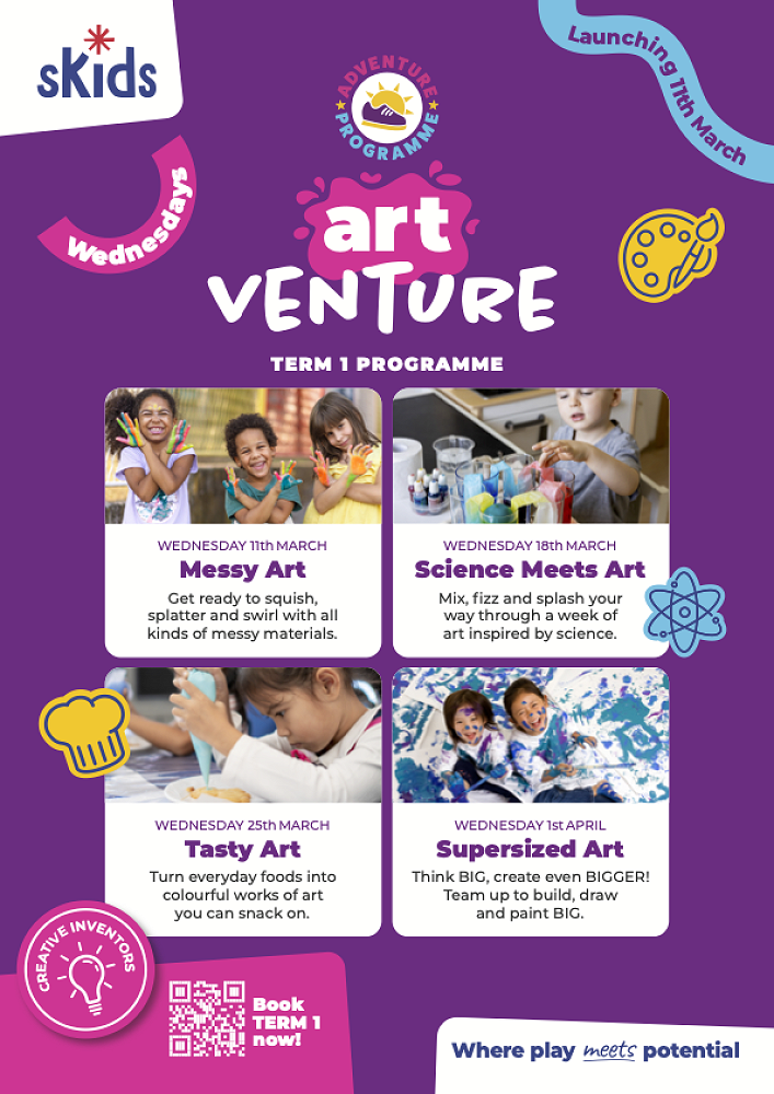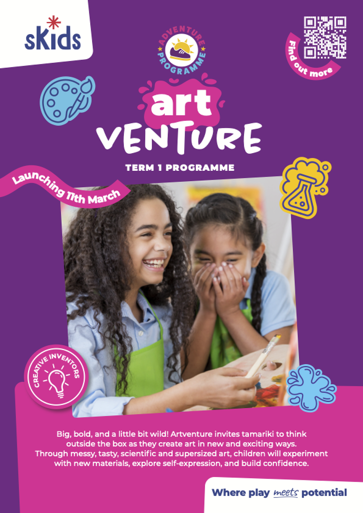 Artventure follows from Wed 11 Mar - Wed 1 Apr. Big, bold, and a little bit wild — Art-venture invites tamariki to think outside the box as they create art in new and exciting ways.