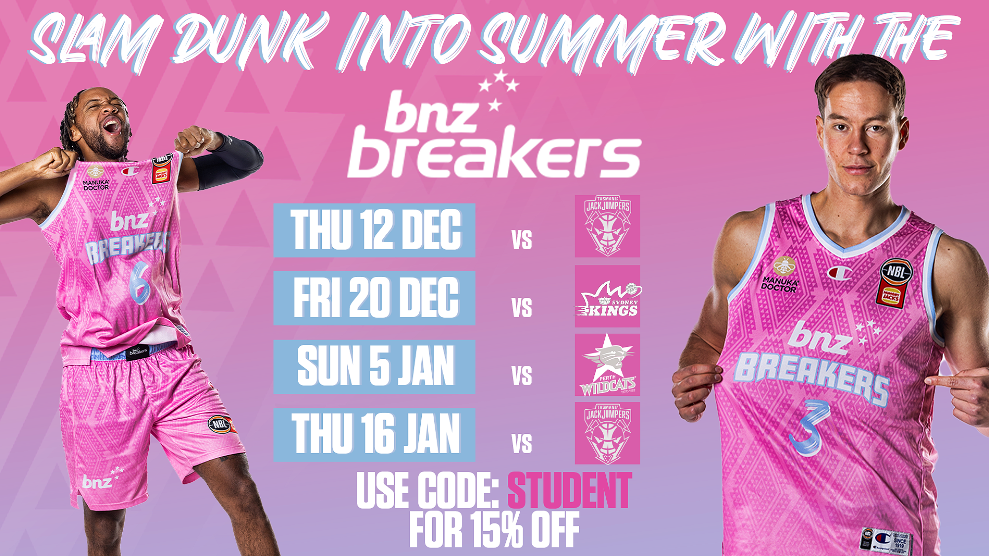 Save 15% on tickets to any of the BNZ Breaker’s games in Auckland during December and January.