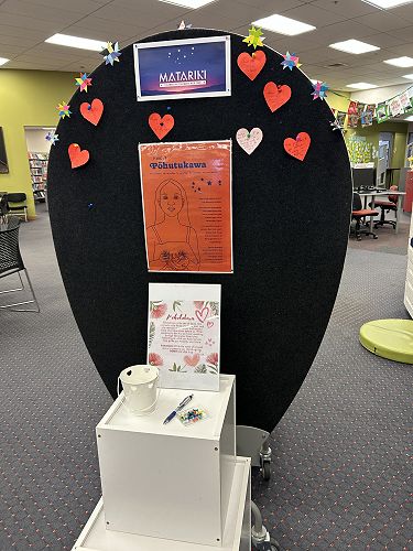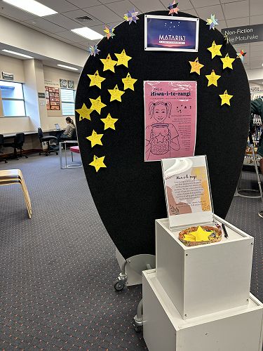 Miss Heta and the wonderful team in te whare pukapuka (the Library) put together and interactive display where kaiako and ākonga could write wishes and memories on ngā whetū(stars) and ngā manawa (hearts). These represent the stars in the constellation of Hiwa-i-te-rangi who is about goals, wishes and aspirations, and Pōhutukawa who is the star that is connected those that have passed on. Thanks to Kahu and August for writing the words about the stars.