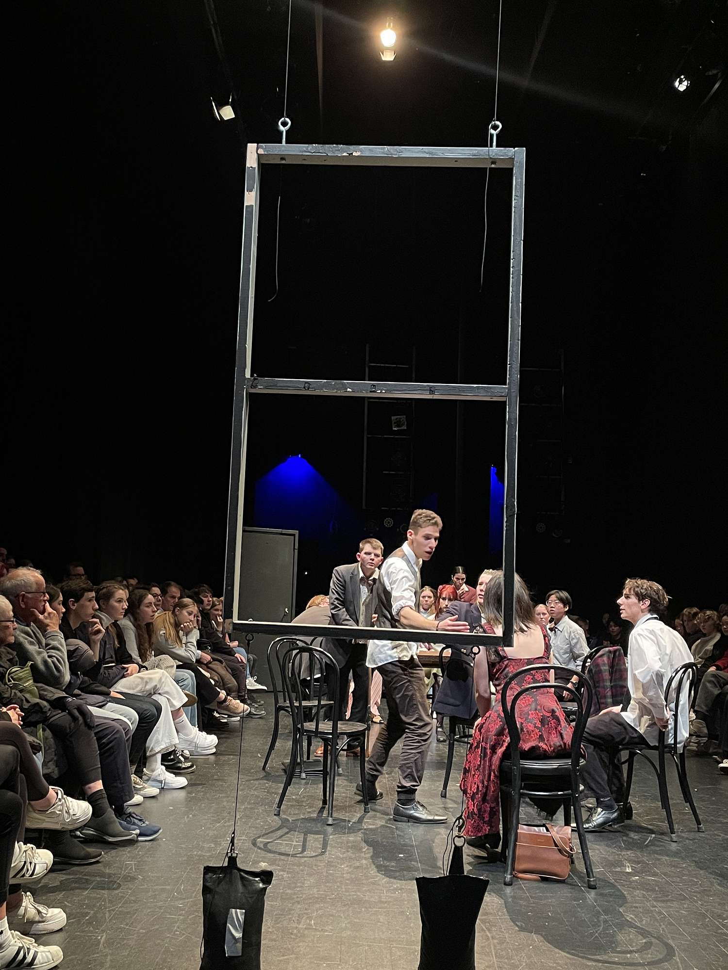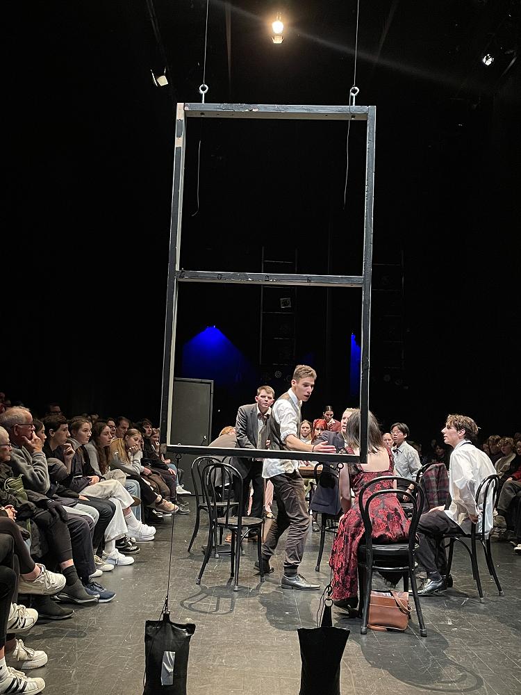The first was “12 Angry Men”. A play set in a 1960’s jury room in America. The choice to set this in traverse in the Aurora Centre made for intimate viewing for the audience and a challenge for the actors. There is no place to hide in this form of audience set up! This play was a resounding success and the large number of people who attended was both supportive for the students but also showed how much people have missed live performance in these uncertain times.