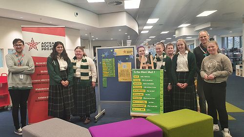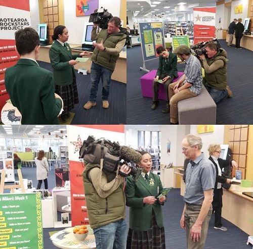 This year I was selected to participate in the Aotearoa Rockstars project which meant that I was given the opportunity to teach Te Reo Māori to members of our wider community. Each Monday morning everyone involved in the programme met in the library and we practised our Māori words of the week, sung waiata and discussed how to go up to people in an approachable manner. We also reflected on how to improve our outing from the previous week. Tuesdays were when our groups would split off and travel to their different locations. I was part of the Fendalton Library group and we set up all of our flags, banners and posters in the foyer. We provided fresh fruit to anybody who wanted it and had some comfy seats to encourage people to come sit down and learn some Te Reo with us.