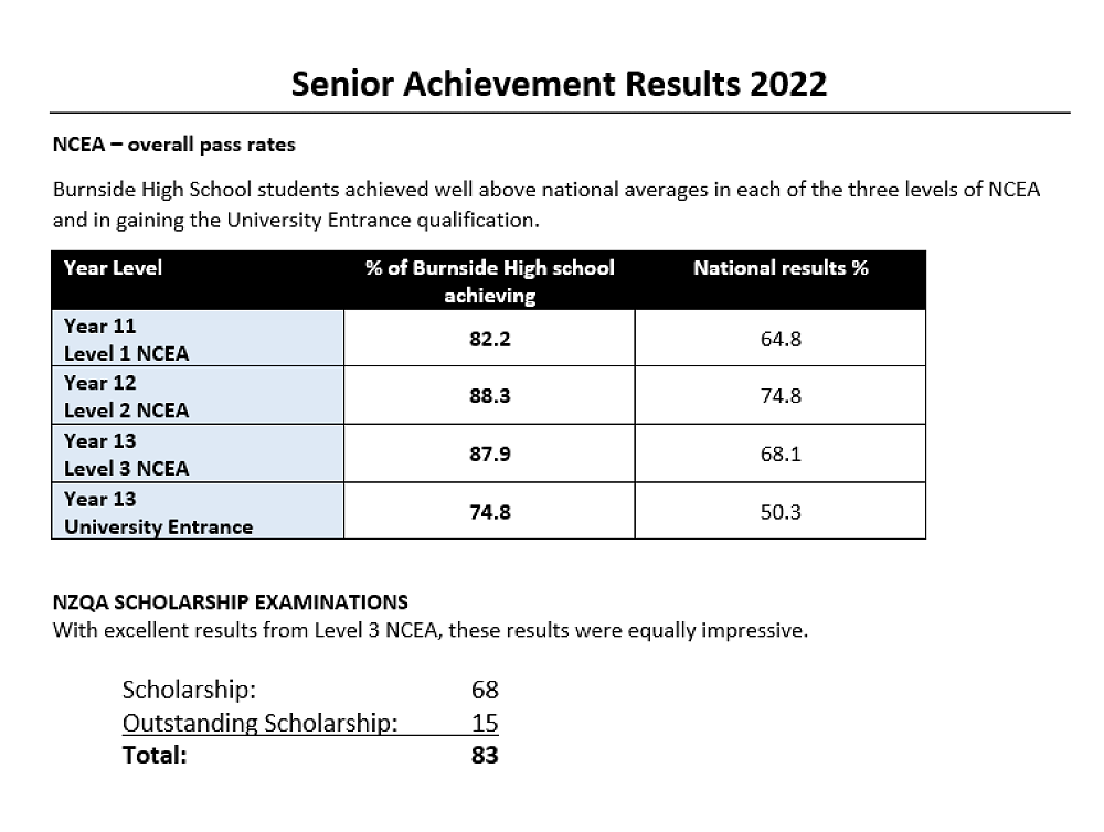 Burnside High School students achieved well above national averages in each of the three levels of NCEA and in gaining the University Entrance qualification.