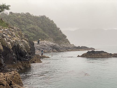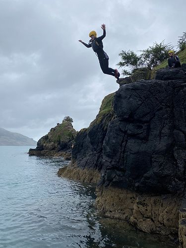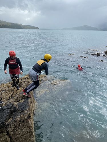 Every pupil was tasked with the safety of those in front and behind them whilst climbing over barnacle-covered rocks, wading through lapping waves and eventually reaching an impassable gap filled with surging seawater. The shock was still visible on the pupils' (and this teacher's) face even as the instructor resurfaced from demonstrating a safe entry into deep water. Each pupil supported the next "diver" as they shuffled towards the edge of the rock and proceeded to jump into the dark depths below.