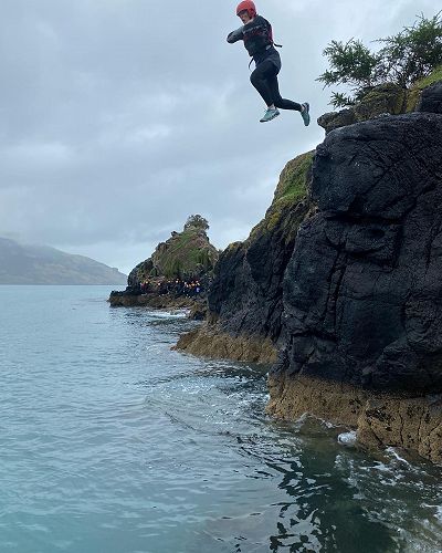 The afternoon session was Coasteering, which was met with gentle caution as the wetsuits, helmets and lifejackets were handed out. This caution turned to hysterical laughter as pupils lost their grip on the rope that ran along what was once a path and now a giant mudslide down to the coastline. Everybody arrived safely to the beach below, though their black wetsuits were now two tone with the thick red mud. As the groups surveyed the rugged coastline it quickly became clear that the image of gently plodding along with a map and compass that "Coasteering" may have conjured, couldn't be further from the truth.