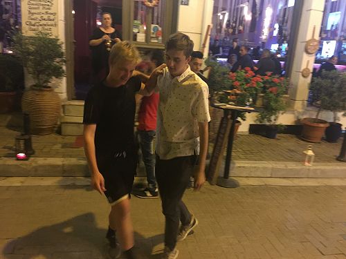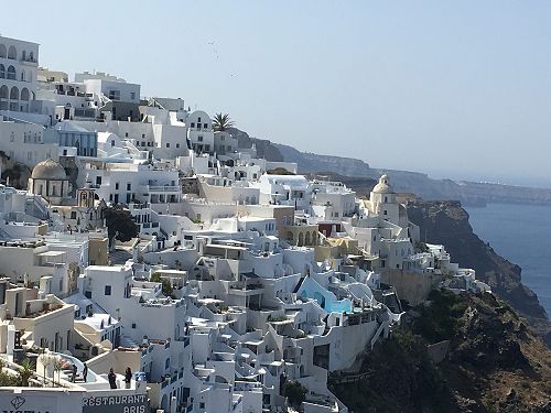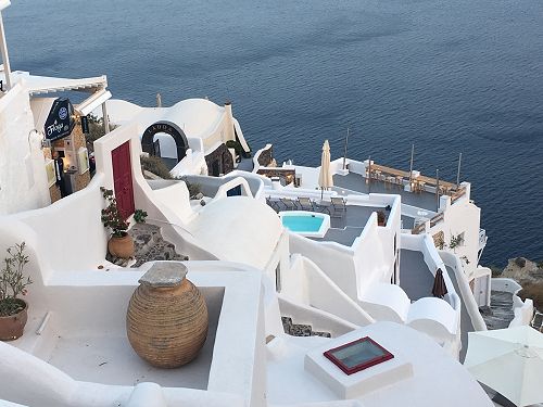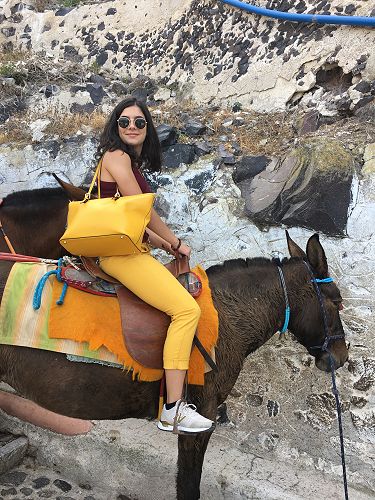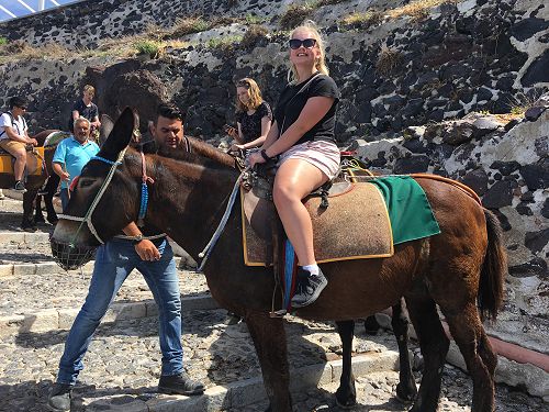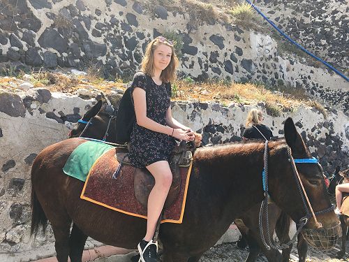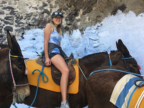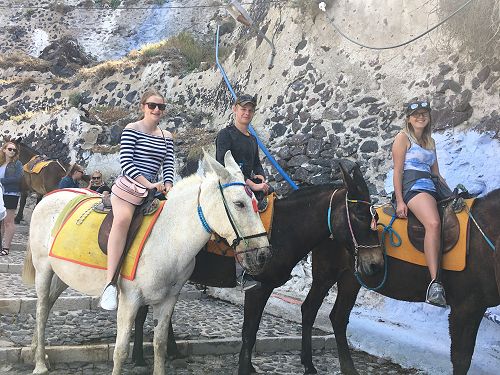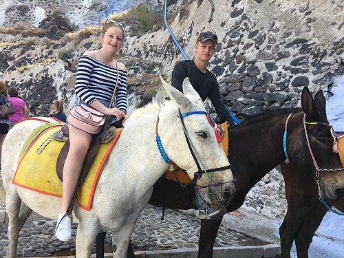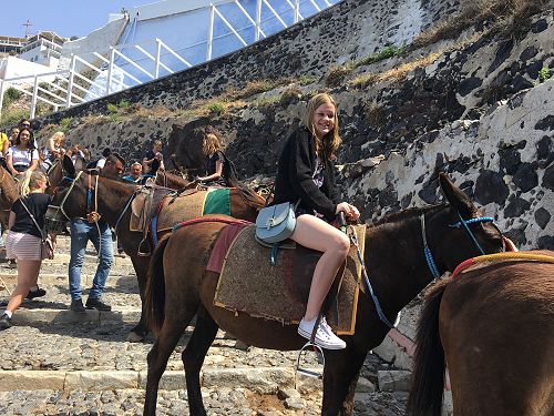 Santorini was a more relaxed time, and other than a short guided tour of the ancient city of Akrotiri, our days consisted mostly of swimming, shopping, walking around the town, eating souvlaki, and getting the holiday of our lives. One of the highlights was the donkey ride up and down the skala (300 plus steps), very close to the edge with a beautiful view. One of the days we took a bus to Oía, a beautiful village with whitewashed houses built into the cliff side, where we spent the afternoon and had dinner and of course, did more shopping.