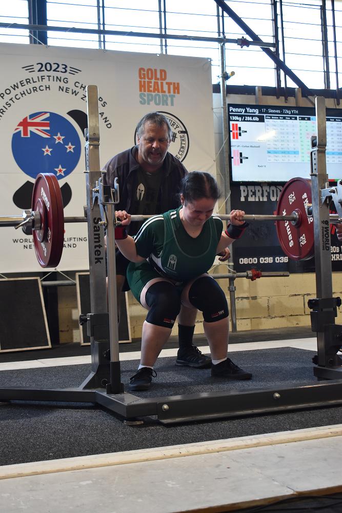 Penny Yang: Squat 130kg, bench 62kg, deadlift 120, 1st in division, 3rd best female junior lifter overall and NZ national squat record (U72kg Youth). Penny has also been selected to compete at the WPNZ World championships in Italy this year and recently passed her world powerlifting level 4 referees examination.