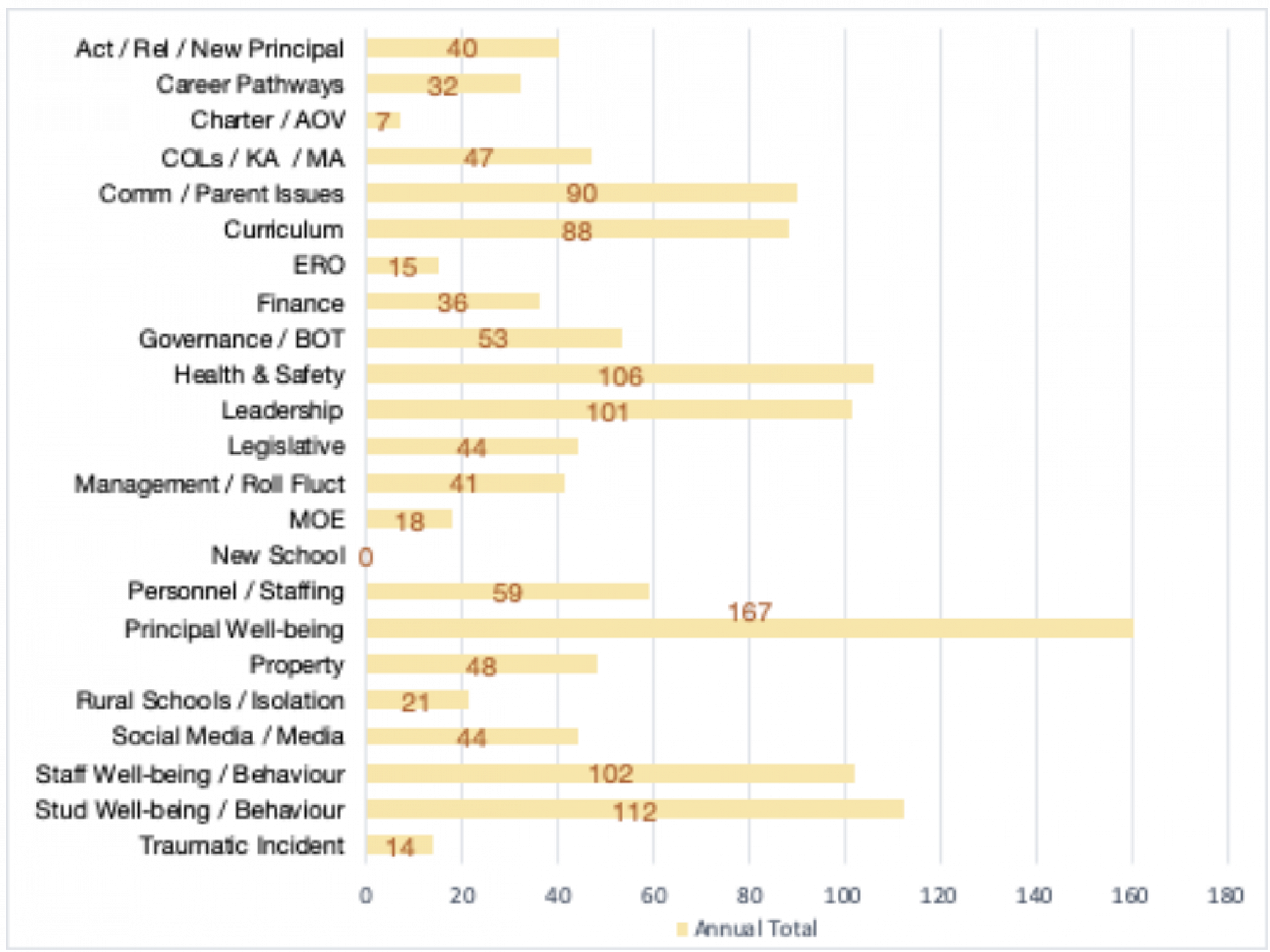 Every school visit generates a range of discussion topics each of which have been marked separately, so for example one visit may include 4-5 items recorded. Principal well-being is usually the highest and includes a wide array of matters, personal and professional advice, guidance and reassurance. It is important to note these are not necessarily always negatives