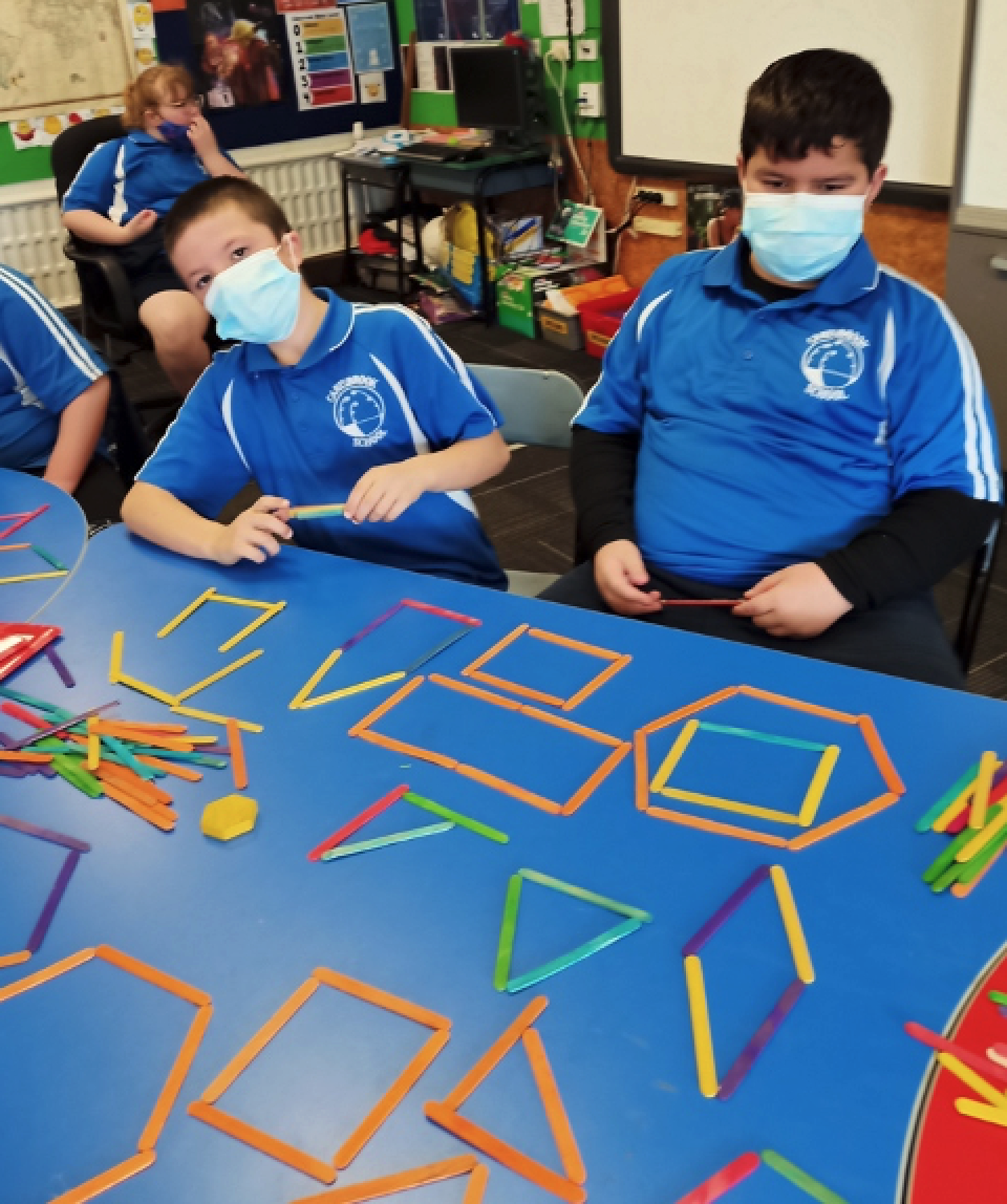 Rico and Riley making geometric shapes using popsicle sticks during Maths.