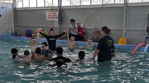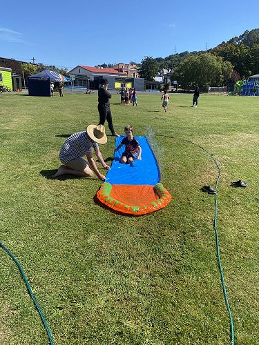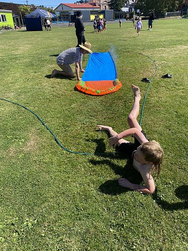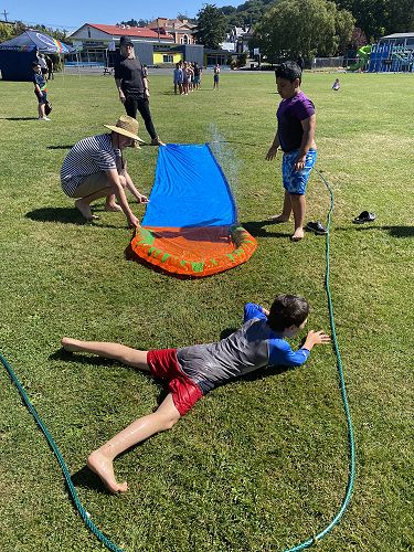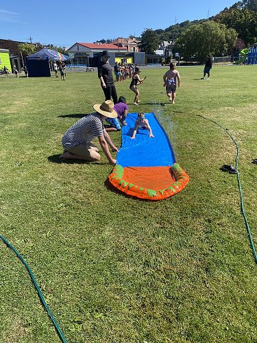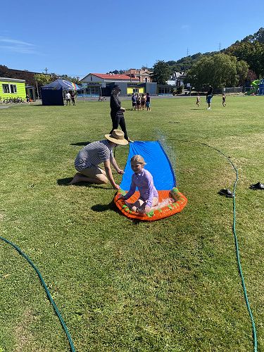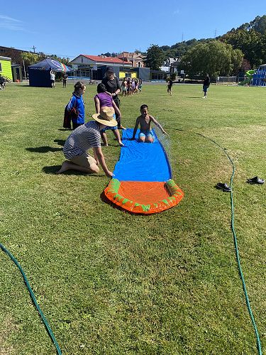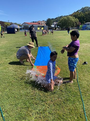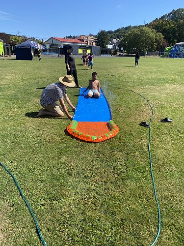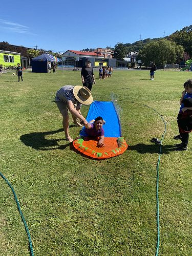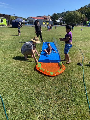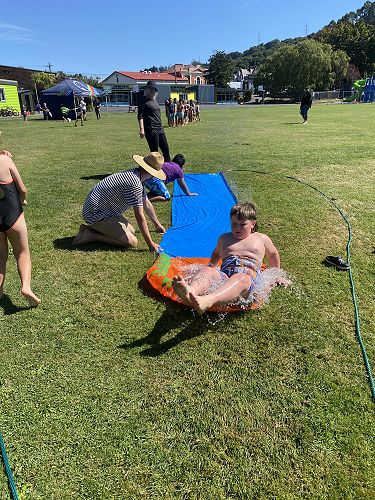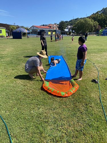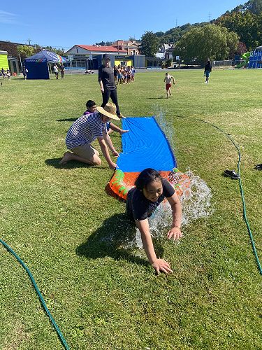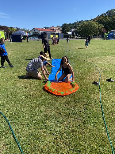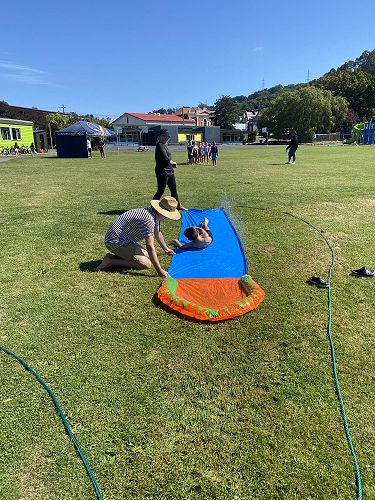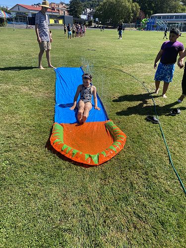 To celebrate a successful fortnight of swimming lessons with fantastic participation, earlier this term Rūma Kākāpō had a waterslide on the field.