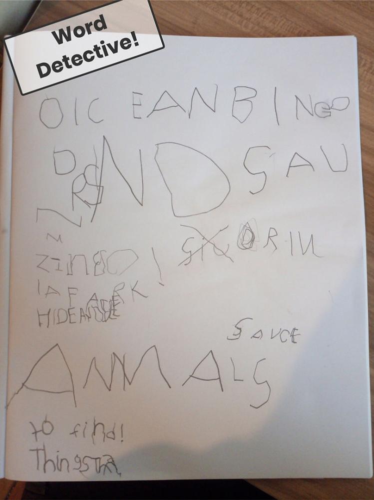 One of our writing tasks one day was to become a super word detective. We had to explore around our houses hunting for words and writing them down. Finley found all of these words on his hunt.