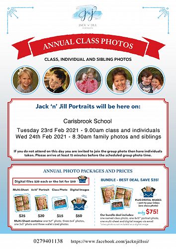 Melissa from Jack 'n' Jill is our new Photographer this year and she will be at school on Tuesday, 23 February to take all class and individual photos. Then on Wednesday, 24 February she will be back to take any family or sibling photos.