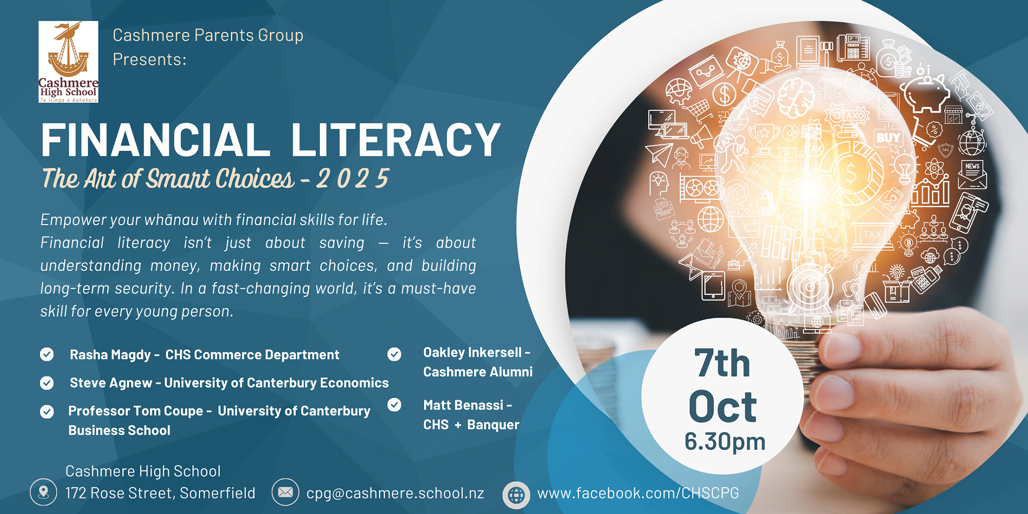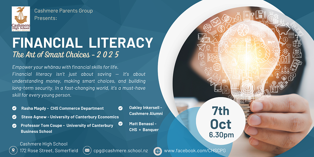 A great toolkit for Parents and Families, supporting your students for a financially healthy future. Starting with drinks & nibbles served at 6.00pm in the Performing Arts Centre Foyer, come along to learn just what Financial literacy is. How do Commerce subjects in Cashmere link to Financial Literacy? Together with Rasha Magdy and Matt Benassi from the Cashmere High Commerce Faculty, we have 3 Professors and Lecturers from the University of Canterbury Business School, and a Cashmere High School Alumnus running a successful business presenting. They will share and also answer questions to help parents gain knowledge and tools not only for themselves but to support their whānau.