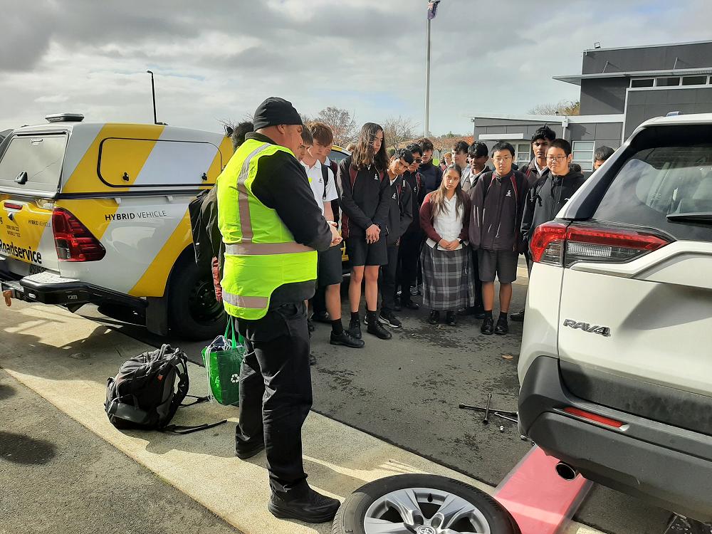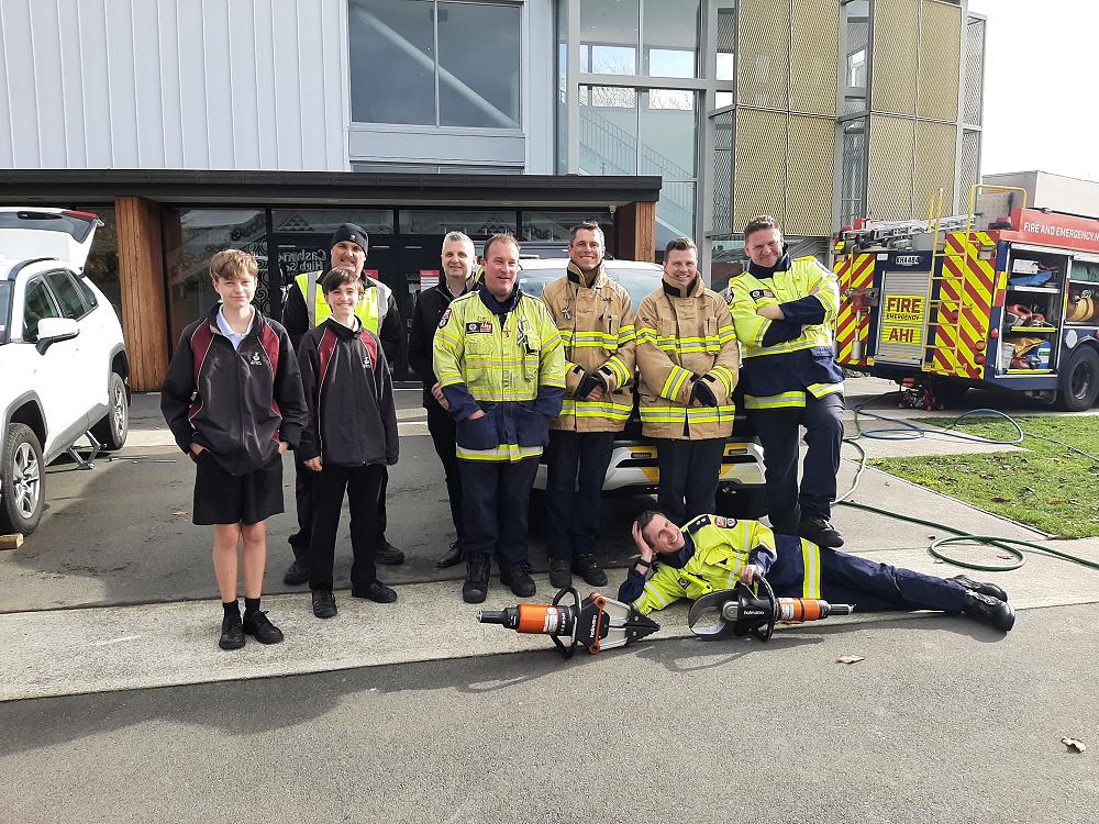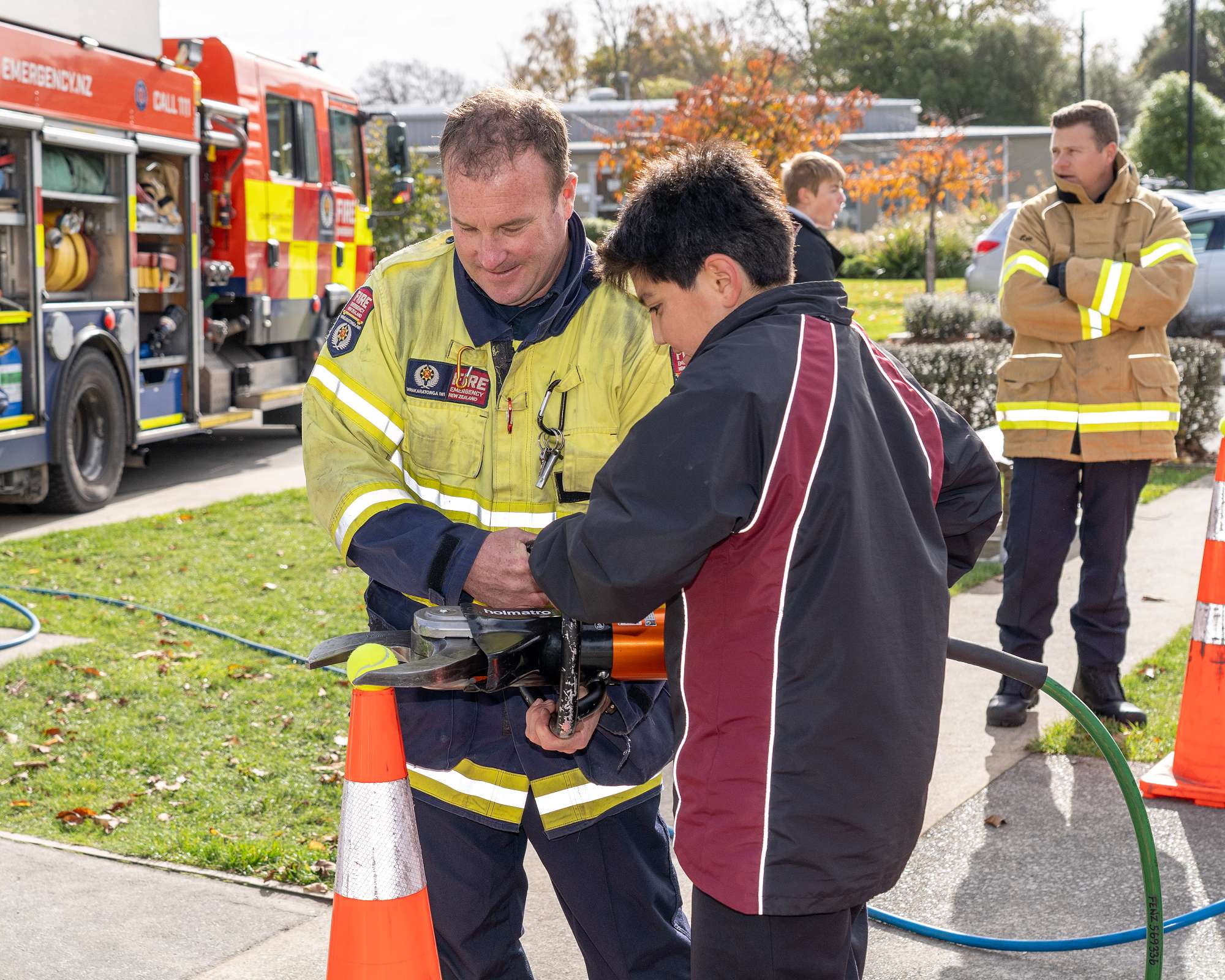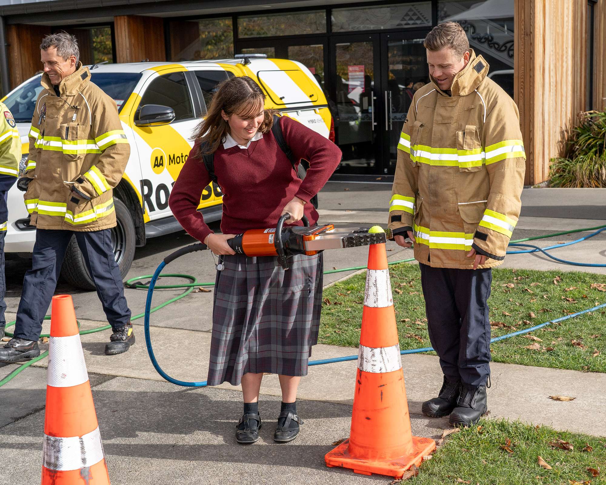 Wednesday saw a firetruck arrive on campus, though thankfully, nothing was ablaze. Cashmere hosted the AA and Fire and Emergency NZ, who ran safety demonstrations as part of Road Safety Week. This is the second year we’ve run this event, organised by Year 10 student Liam Gibling Morrison, leader of our service group Students Against Dangerous Driving. Liam was supported by fellow junior students Michael Fenton and Cooper Johnston; the entire SADD group should be proud of their mahi which promotes safety messages for the school community as both pedestrians and drivers. Students from across the school signed up to learn how to remove a car tyre with a wrench, while others got the chance to use FENZ’s hydraulic rescue equipment on the firetruck.
