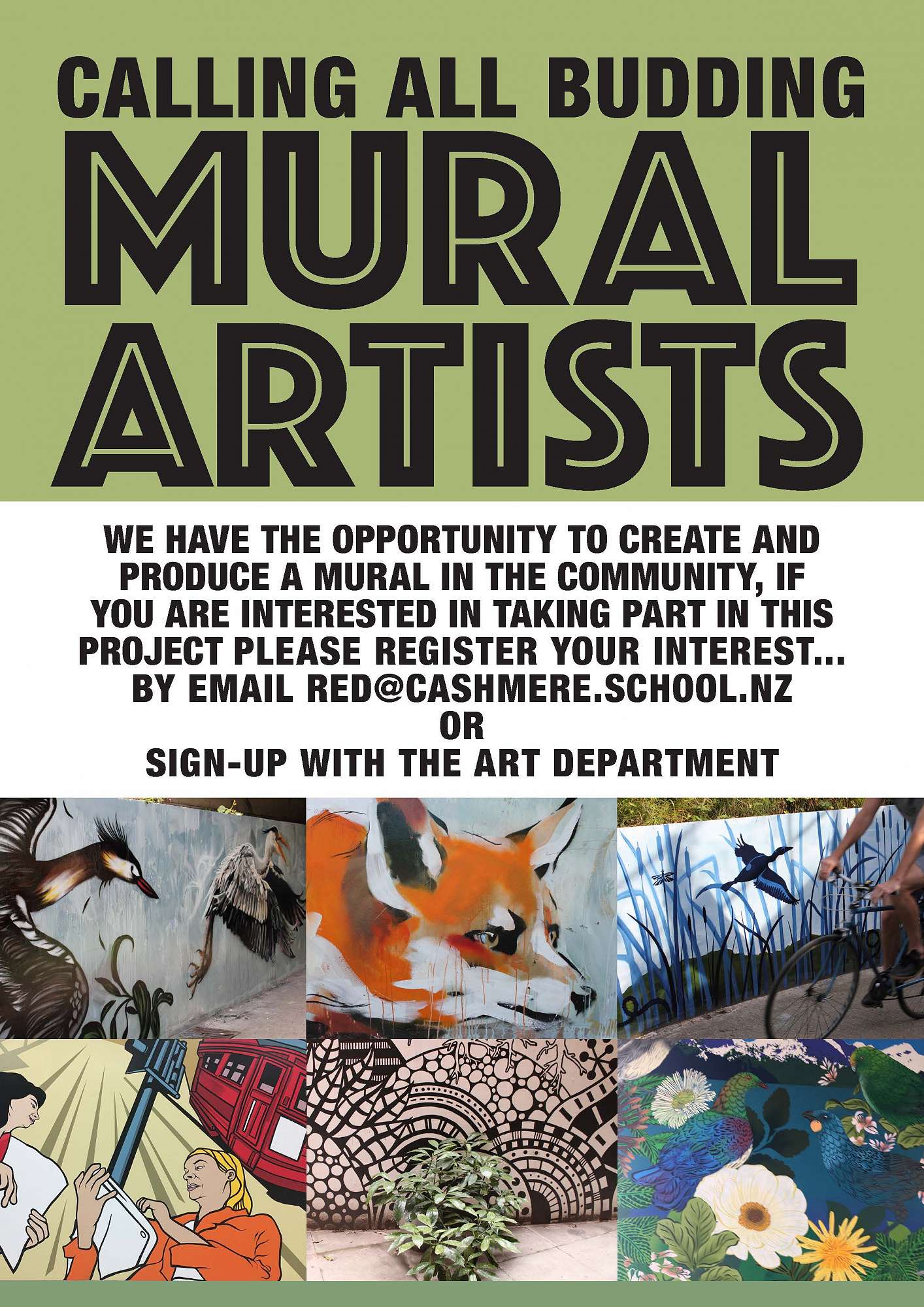 You will have noticed all the building work happening around the school and as part of the on-going plan to improve the school environment we are in early planning stages to embark on some new mural art works. One of the proposals is to visually represent the school COVE values. We will be inviting your ideas and contributions soon in some brain storming sessions, so put your thinking caps on ... and watch for more information on how you can get involved. If your ideas can't wait or you just want to register your interest please email red@cashmere.school.nz